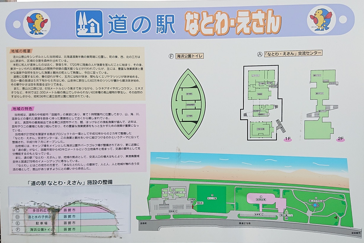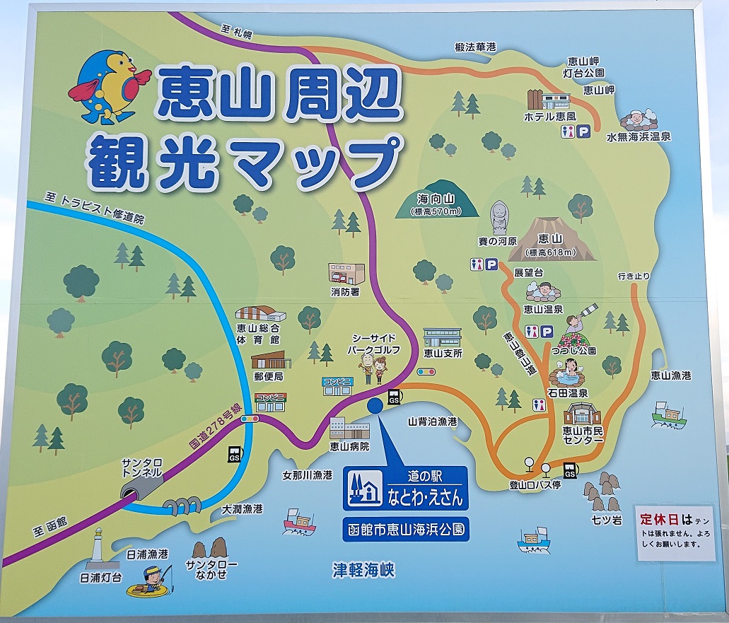 道の駅に設置されていた周辺の観光マップ。恵山と海向山には登山道が整備されているので、登山客が多く訪れるようだ。