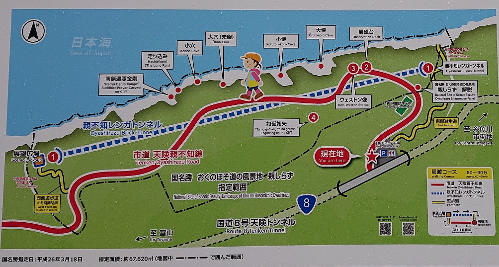 親不知ICから数ヶ所の覆道を通り、風波洞門を抜けてすぐ右側に「親不知」の案内標識が現れる。