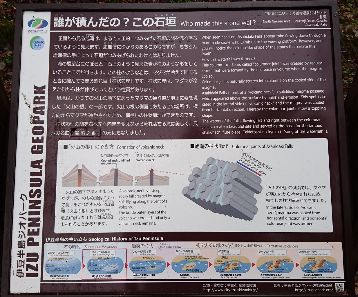 柱状節理の断面の上を流れ落ちる滝で、その様はあたかも人工的に作られた石垣の壁を流れ落ちるようにも見える。