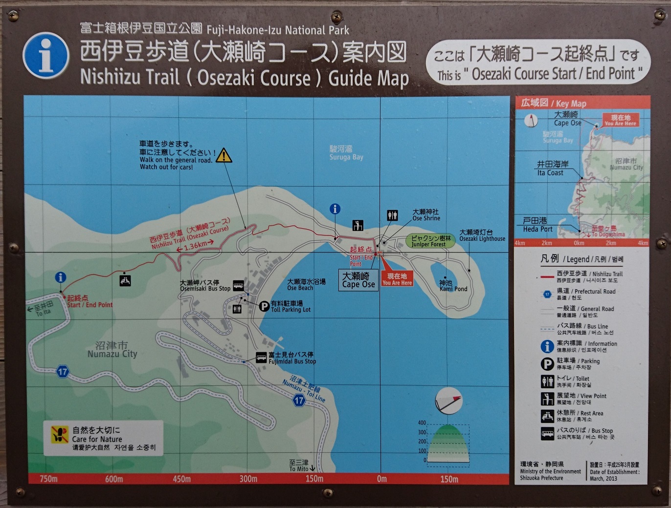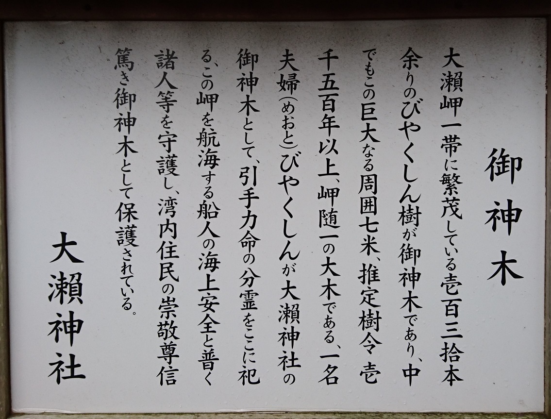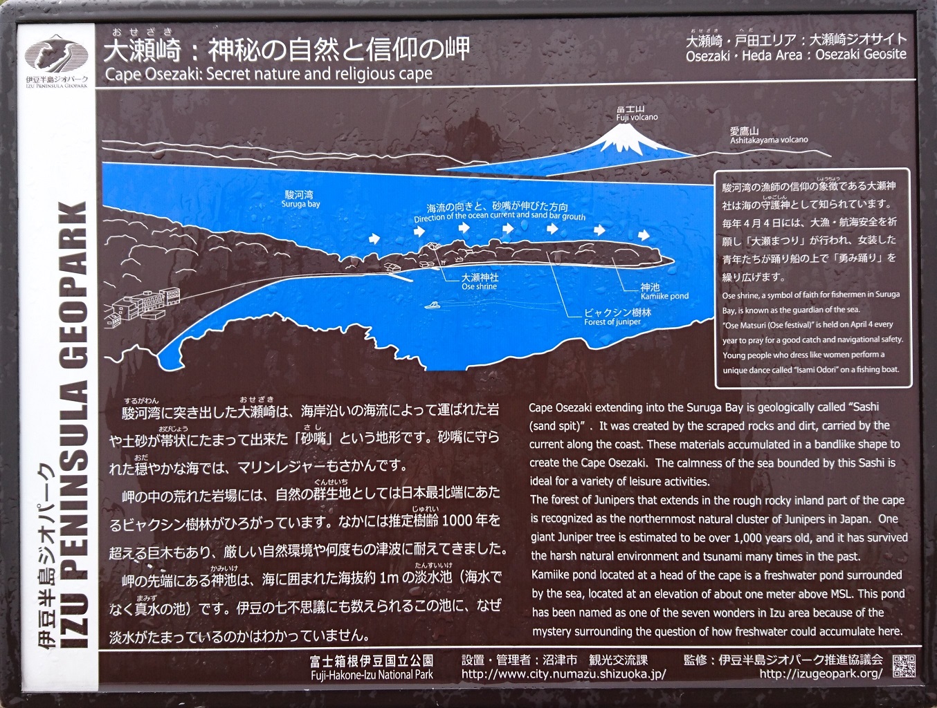 - 天気が良い日には、海越しに富士山が良く見られる名勝地である。大瀬崎にある大瀬神社は海の守護神として祀られている神社で、1000年以上もの歴史のある神社という。また周辺に群生しているビャクシン樹林は国指定天然記念物となっており約130本も自生しているようだ。
