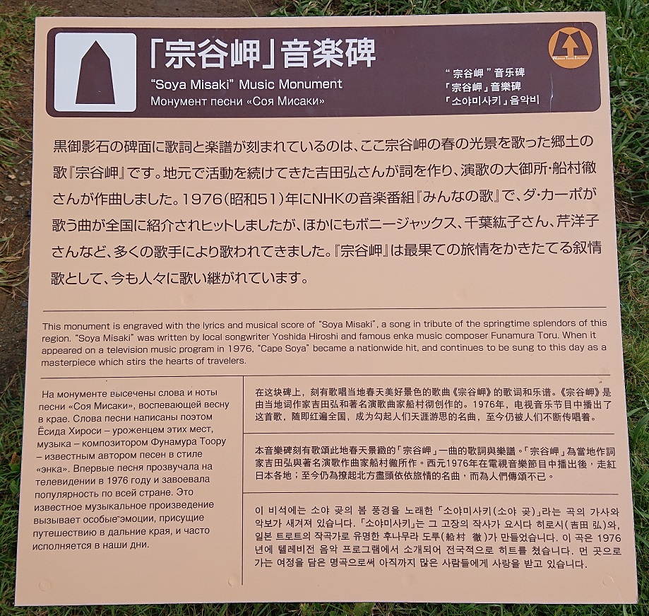 記念碑の近くにもう一つ「宗谷岬」音楽碑というモニュメントがある。モニュメントには押しボタンスイッチがあり、ボタンを押すと歌謡曲が流れだす仕組みになっていた。その歌は、宗谷岬の春の光景を歌った「宗谷岬」という題名の歌であった。