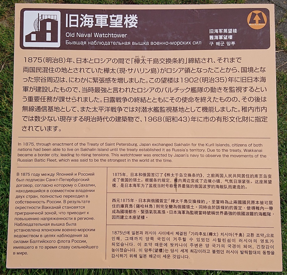 公園のある丘に登り、丘の上から岬の方を眺めて見た。天気が良ければ海の向こうにサハリン島が見えるらしいが、あいにくの曇り空で島影すらも見る事は出来なかった。ちなみに島までは直線距離で約43kmの距離になる。