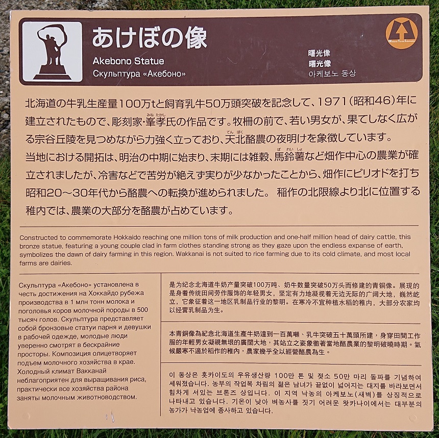 男女が海を背にして肩を寄せ合い宗谷丘陵を見つめる像。これも平和を願い建てられた銅像かなと思いきや説明板をよく見ると、北海道の牛乳生産量100tと飼育乳牛50万頭突破記念の銅像と書いてある。これがどれほど凄い事なのかは正直想像がつかないが、開拓時代の苦労の表れだったのかも知れない。