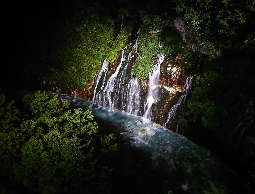 白ひげの滝は、ブルーリバー橋の上から眺める事が出来る。地層の隙間から湧き出してきた十勝岳連峰の地下水が美瑛川に流れ落ちて、それがブルーリバー(青い川)となっている。夜間にライトアップもしているので近くのホテルに宿泊した際には、夜の散歩がてら見に来ては如何だろうか。とても幻想的ですよ!
