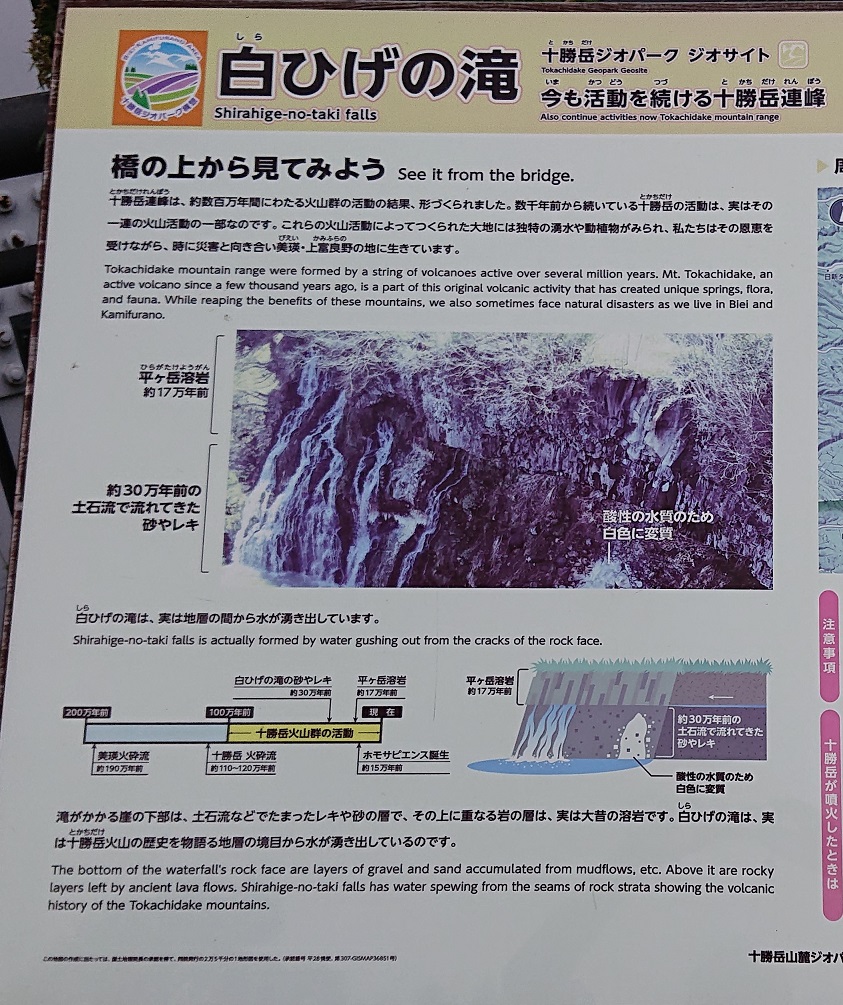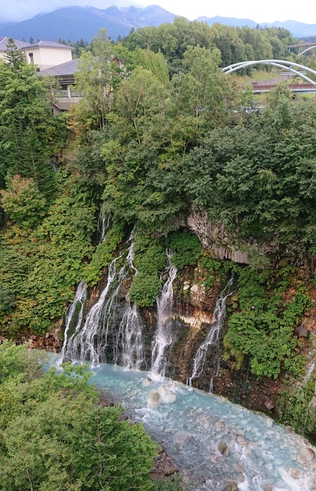 白金温泉街のすぐそばに地層の隙間から流れ落ちる「白ひげの滝」がある。