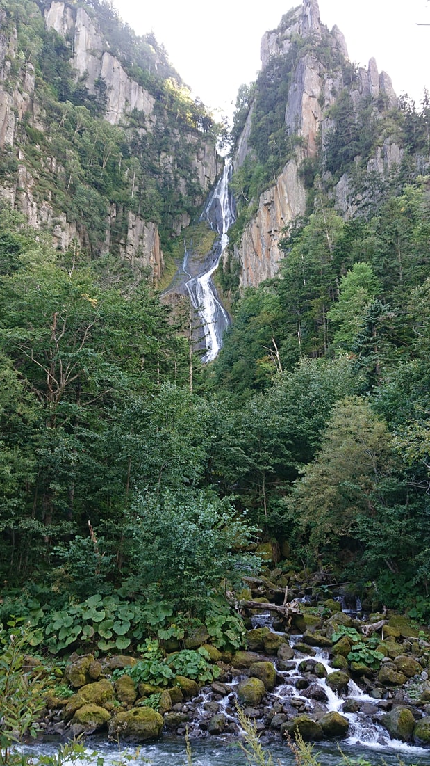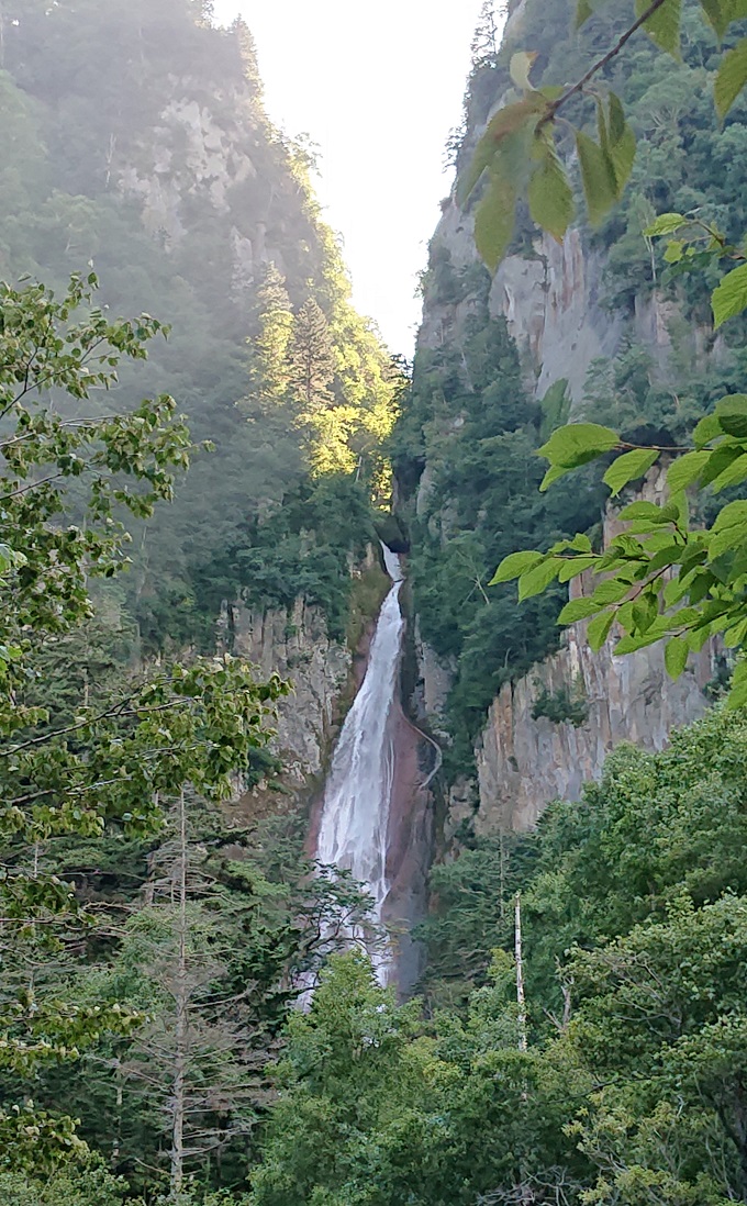 到着して一番初めに見えるのが「流星の滝」木々の隙間から遠目に眺める感じになってしまうが、落差90mの直瀑は力強く流れ落ちていて、雄滝という別名にふさわしい。(※画像をクリックすると拡大写真になります)