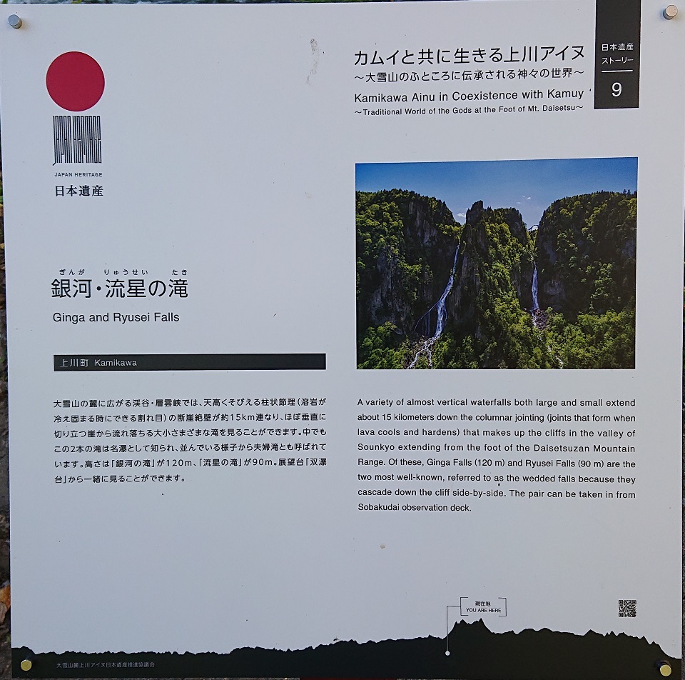 売店の前辺りに周辺の案内図が立っている。周辺には全部で6つの滝名が書かれているが、駐車場部分で見られる滝は「銀河&流星の滝」の2つになる。残りの滝は遊歩道から見られる滝となるのだが、残念なことに遊歩道は現在閉鎖されていて見る事が出来ない。尚、大函に抜ける遊歩道のトンネル部分も閉鎖中だ。