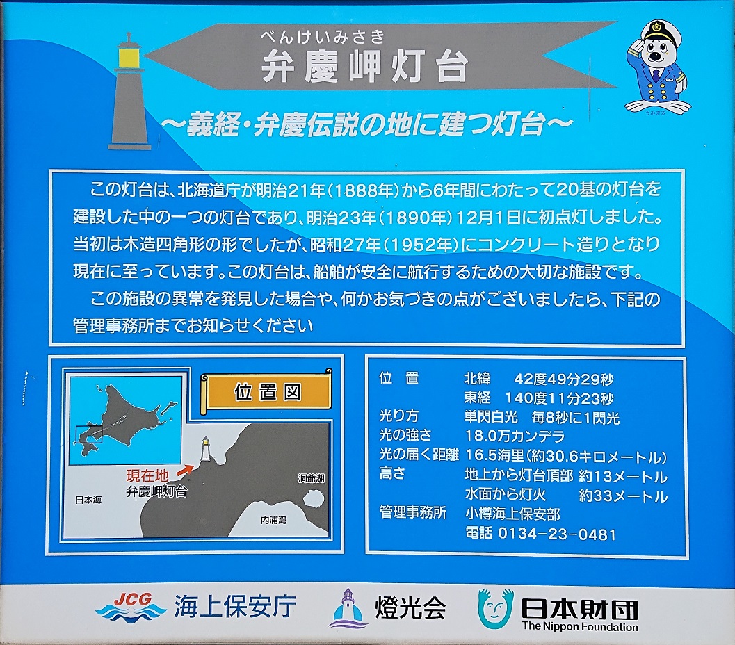 この岬に伝わる弁慶伝説が書かれた看板が立っている。書いてある内容は正直なんだか良く読み取れないが、要約すると「弁慶の舎弟である常陸坊海尊が寿都に向かってきているので、弁慶は毎日岬に出て来てその到着を待っていた。」という事らしい。