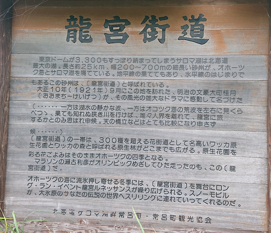 龍宮街道は、ほぼ直線が続く全長で10.5kmになる道だ。分岐点となるこの場所には屋根が架かった休憩場所があり、左に行くと橋を渡って5.0kmほどでワッカの森と呼ばれる場所にたどり着く。右は5.5kmで折り返し地点があるくらい。