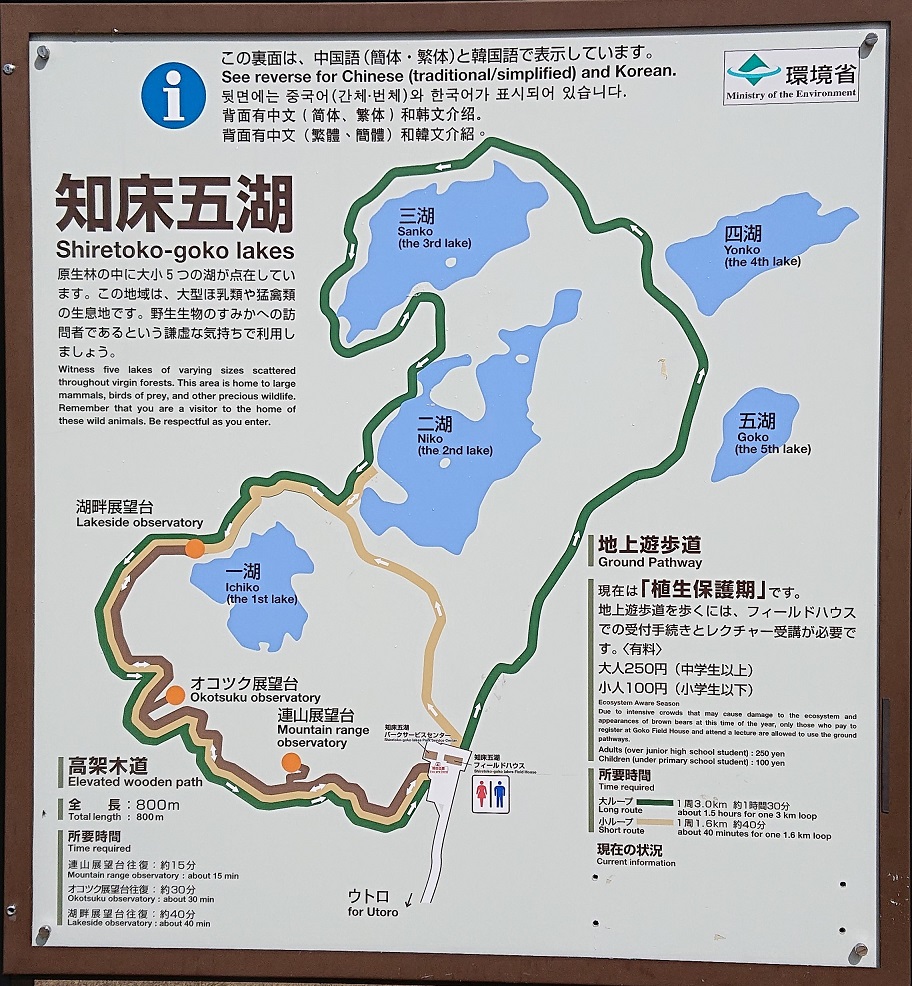 知床五湖には2種類のコースが有り、1つは無料で自由に散策が出来る高架木道コースで、もう一つは有料で受付手続きを行い、レクチャーを受ける事で原生林の中を散策出来る地上遊歩道コースになる。