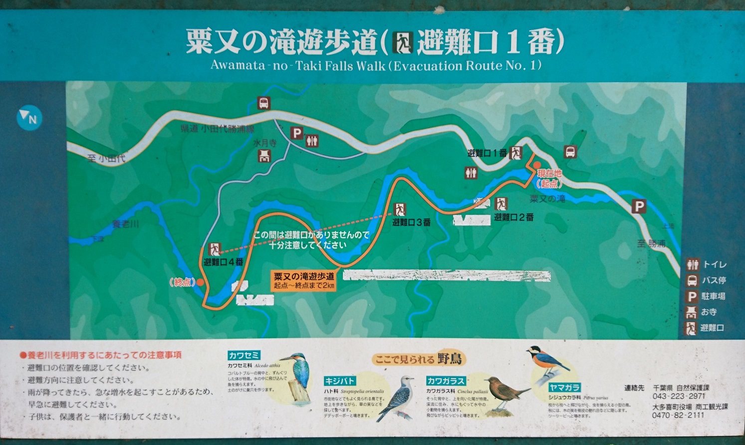 起点と終点それぞれに駐車場があるので、遊歩道を散策するにはどちらが起点となっても問題なさそうだ。ただ避難口の案内図でもある。どうやら雨が降ると川が急に増水する事もあるようだ。雨が降るような日は散策するのは注意が必要だ。