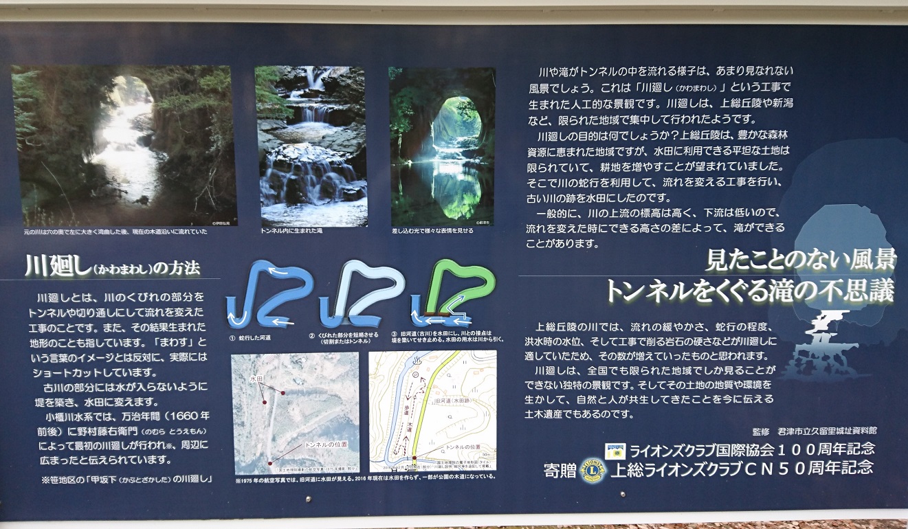 実は川廻しという工事によって人工的に作られたトンネルで有ることが書かれている。その歴史は古く西暦1660年前後に始まったとされ、川廻しによって残った旧河道を水田として利用していたそうです。
