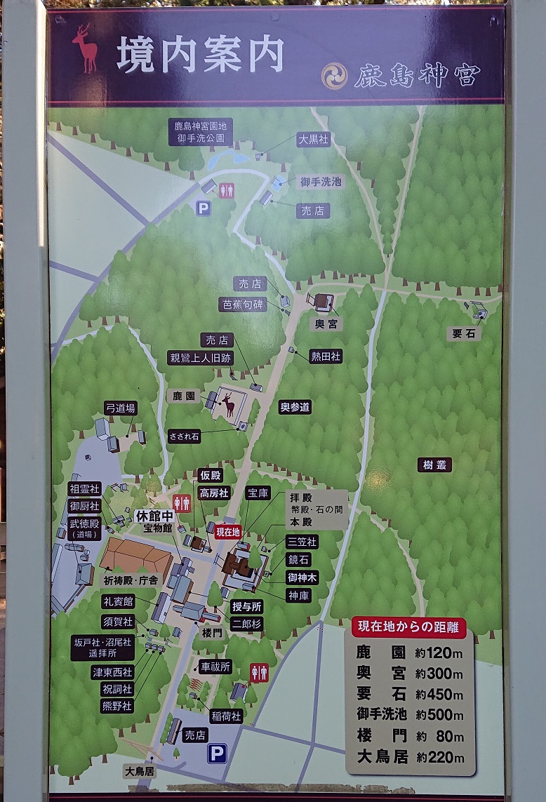境内は東京ドーム15個分ほどの広い敷地で、重要文化財に指定された楼門の他、鹿園や要石、御手洗池といった見所が多くある。
