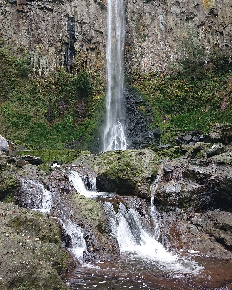 足元に気を付けながらも、川のせせらぎに耳を傾け遊歩道を歩いて行くと、爽快な滝の音と共に前方に滝が見えて来ます。