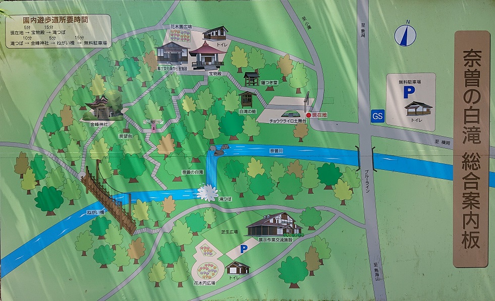 国道7号線を離れ田園風景が広がる県道131号線を通って来ると、奈曽川を渡る橋の交差点の所に「奈曽の白滝」という案内標識が現れる。