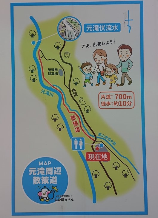 無料駐車場から滝まで散策路を歩きおよそ750m。