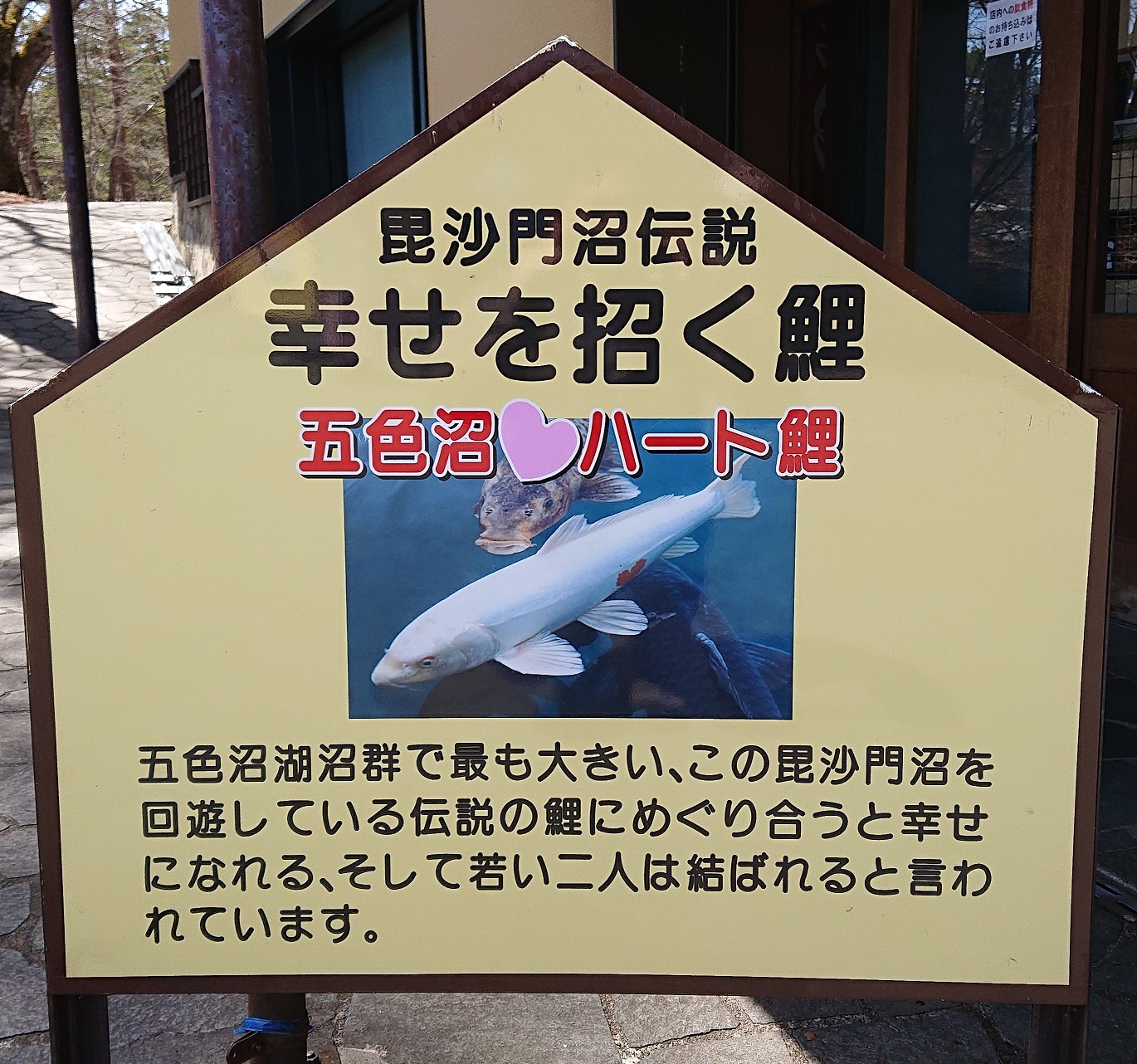 案内標識の方に向かって行くと、右側にはお土産屋さん、左側にはソフトクリーム等を販売している小さい小屋が有る。そしてその奥に大きな毘沙門沼が広がっている。