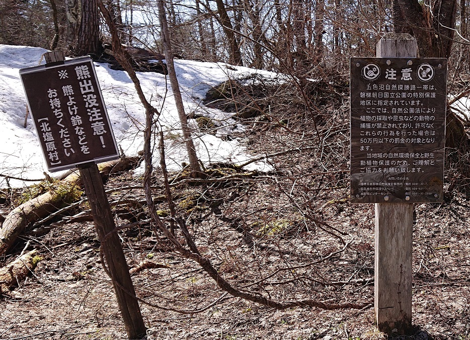 「熊出没注意!」の看板を通り過ぎて少し進んだところに、毘沙門沼展望所がある。ここまでの道のりは、ほぼ毘沙門沼沿いに通って来るルートであったが、別の角度からのんびり眺める沼も悪くはない。