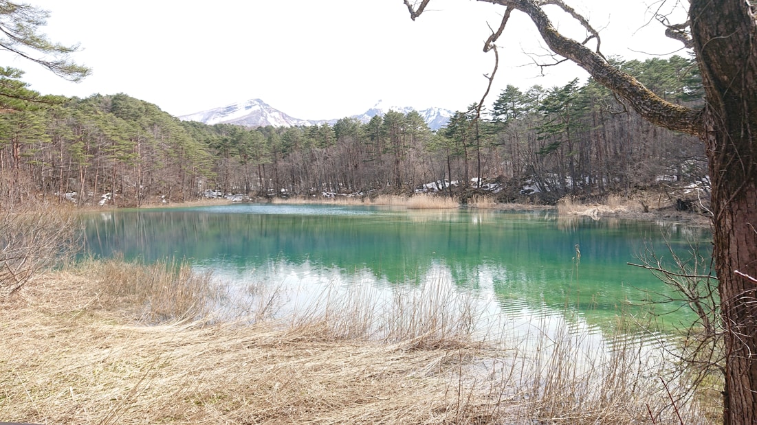 綺麗なエメラルドグリーンの毘沙門沼。その綺麗さに思わず目を奪われてしまった。沼のほとりには貸しボートが有るので、ボートに乗って沼を楽しむことも可能だ。