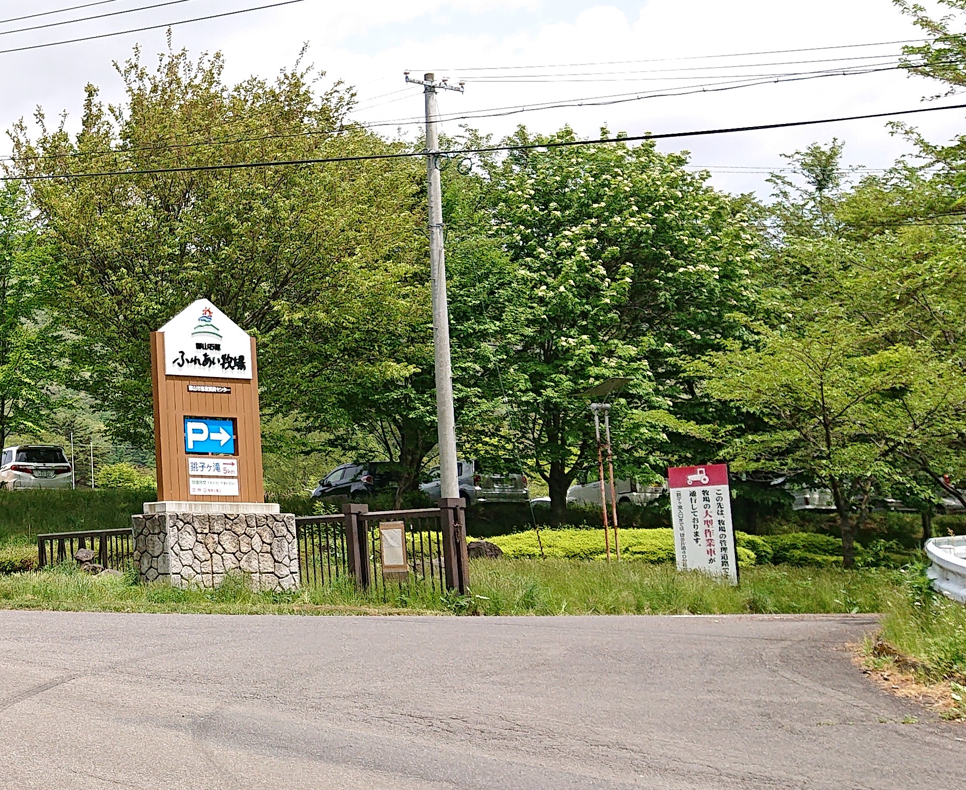 銚子ヶ滝に最も近い、銚子ヶ滝入口の駐車場へ行くには、ふれあい牧場の入口を入り、その先を直進して行く。よく見ると、ふれあい牧場入口の看板の下にも「銚子ヶ滝→」という標識が出ている。