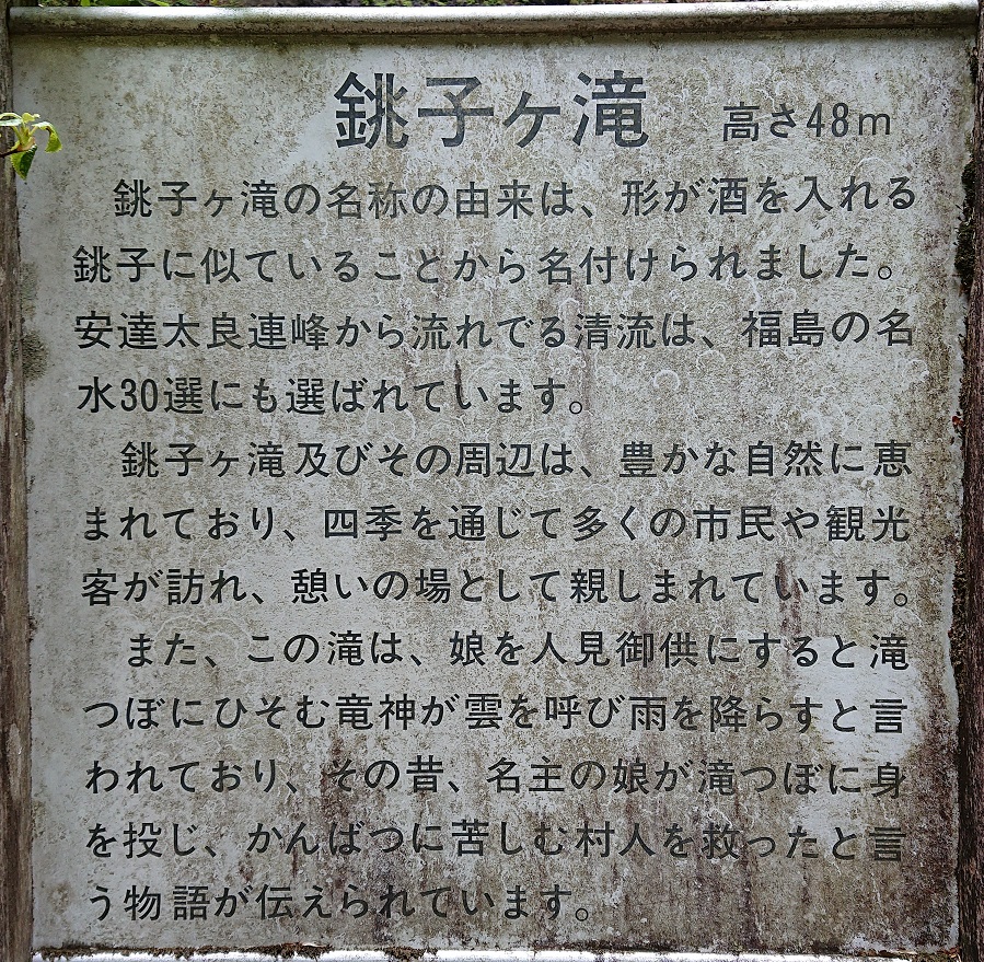 銚子ヶ滝の名称の由来は、流れる滝の形が酒を入れる銚子に似ていることから名付けられたという。滝つぼ付近は急勾配になっていて足場も悪いので運動靴など歩き易い靴で行くことをお薦めする。