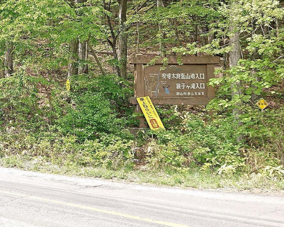 緩やかな山道を歩く事およそ1.0km地点で、安達太良山へと続く登山道との分岐点に到着。銚子ヶ滝へはここからあと400mほどだ。それにしても、熊出没注意の看板があると少しビビリますね。