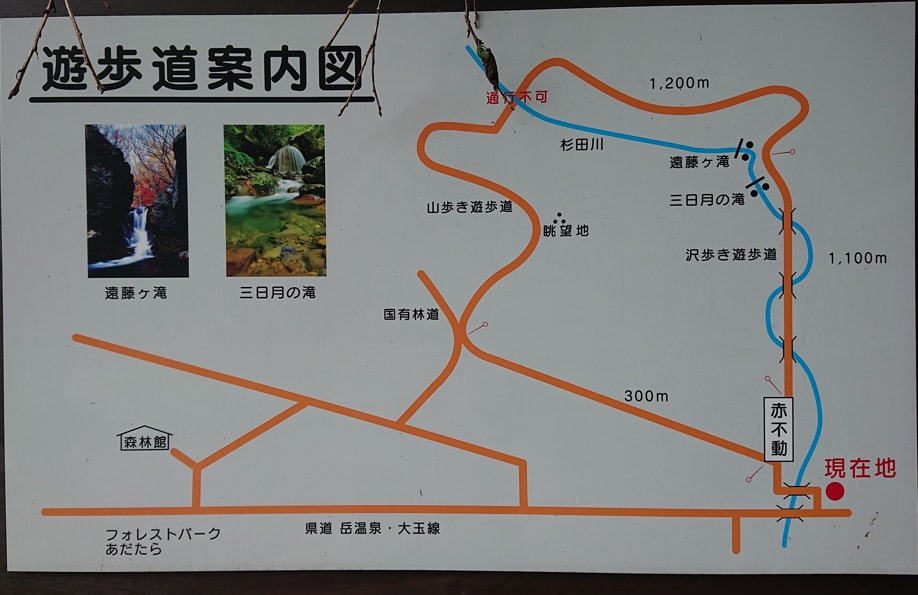 本宮IC(東北道)から国道4号線を本宮方面に進み、およそ5.9kmほど行くと県道30号線と交差する(PLANT5大玉店の交差点)のでそこを左折、およそ6.2kmほど先に「フォレストパークあだたら」への分岐点が出て来るので「フォレストパークあだたら」の方へ左折、突き当りを右折して550mほど先の分岐点を左折して行くと遠藤ヶ滝駐車場に到着。 - ◇ 備 考 ◇