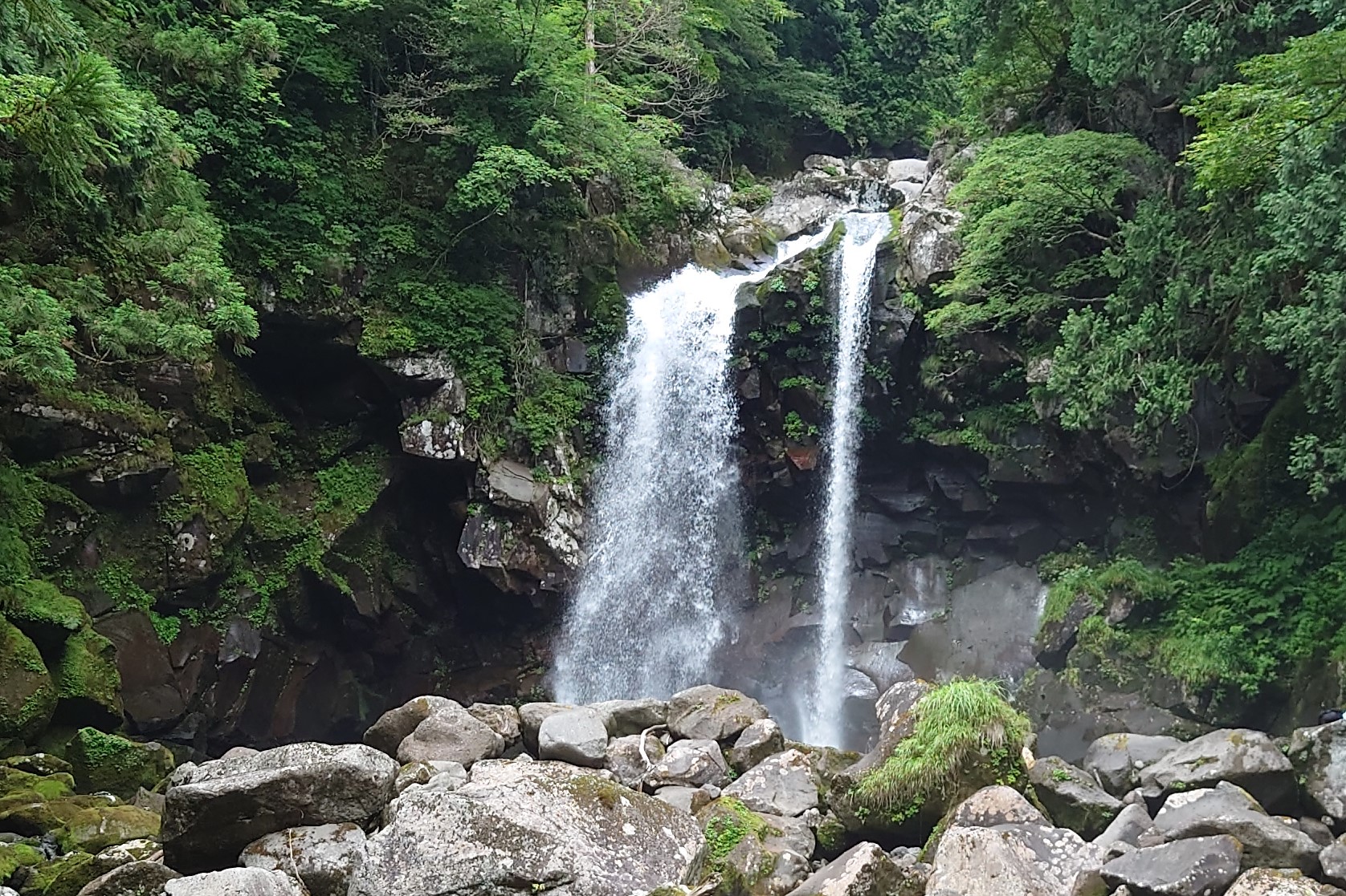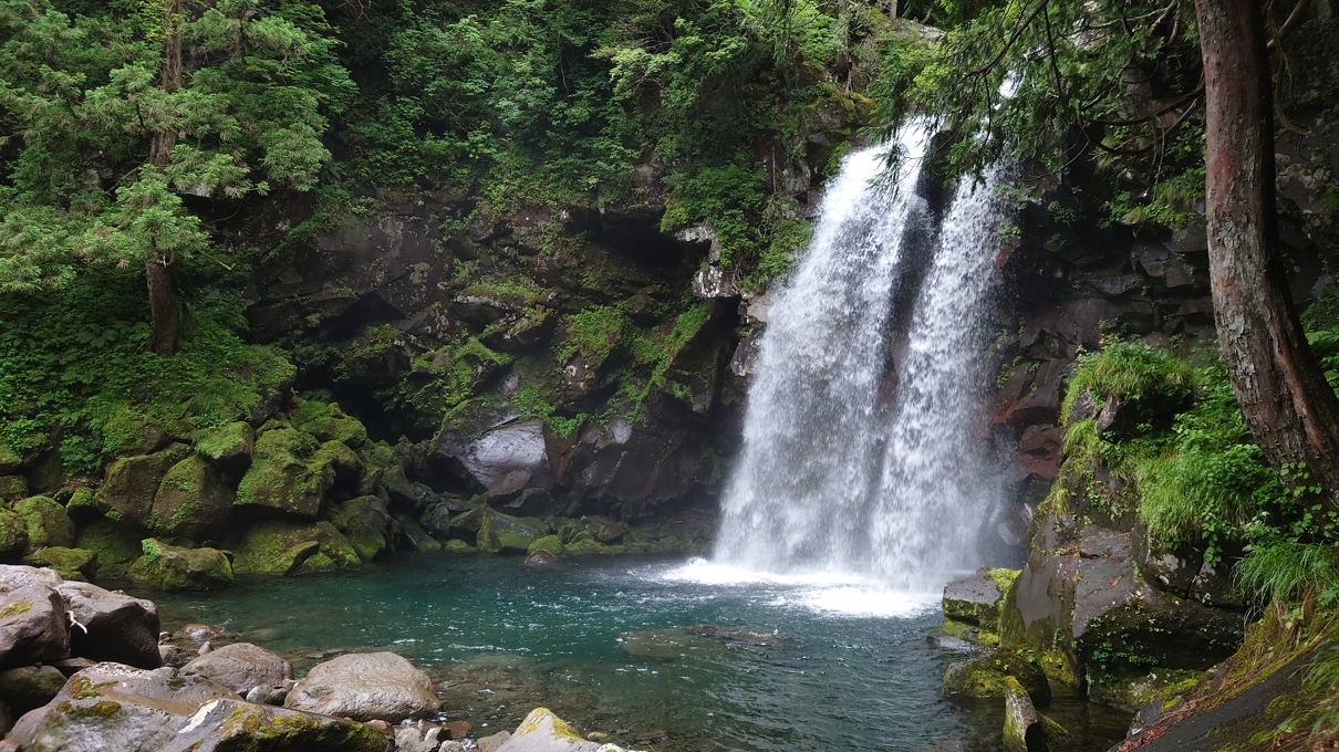 二筋に分かれて流れる滝で、厳冬期には滝全体が凍り巨大な氷柱になるという。